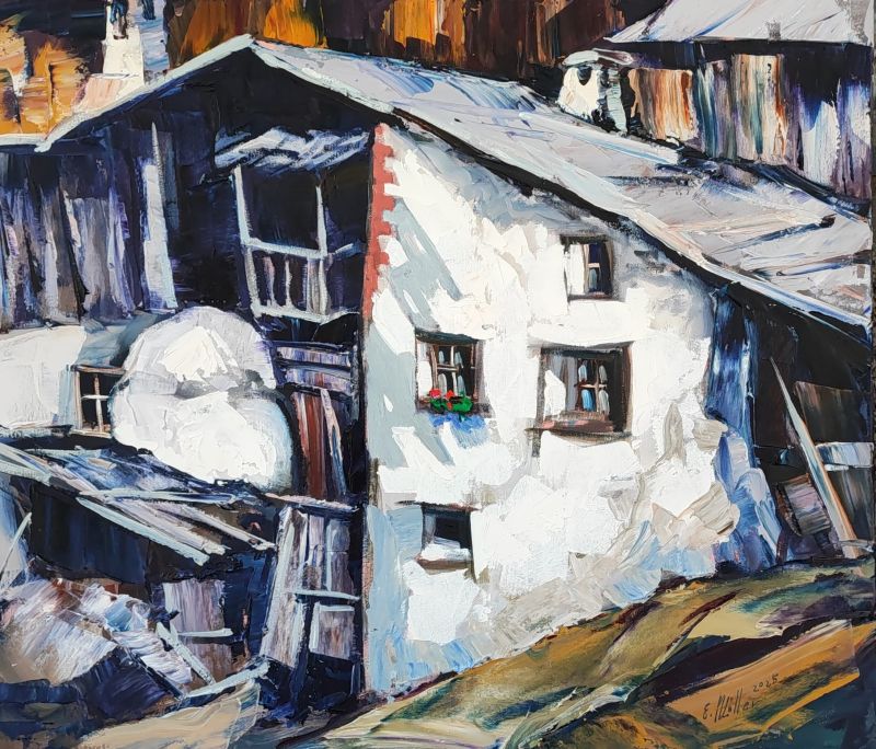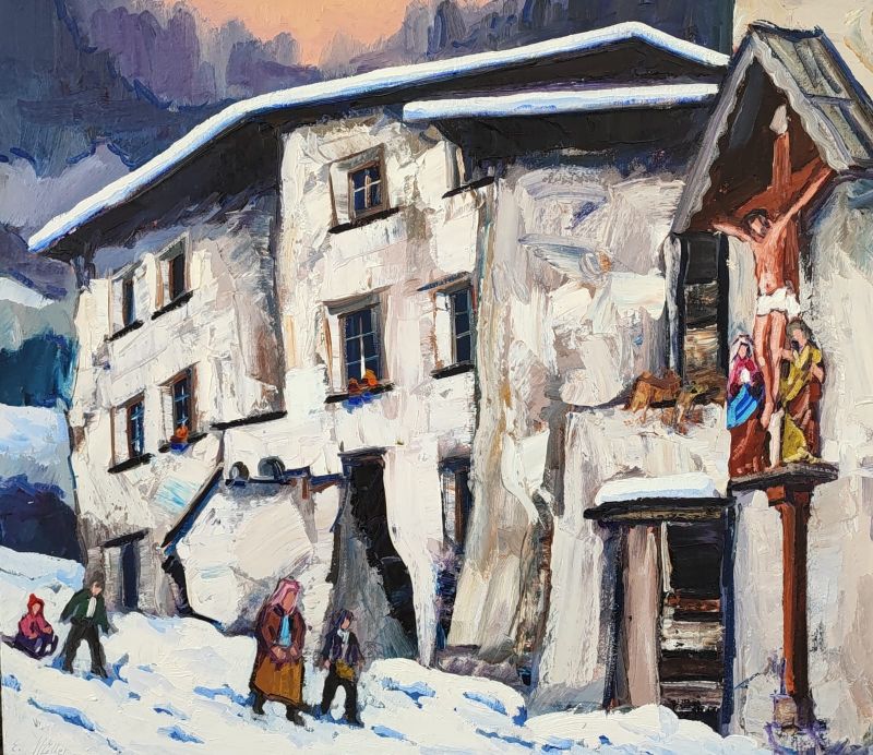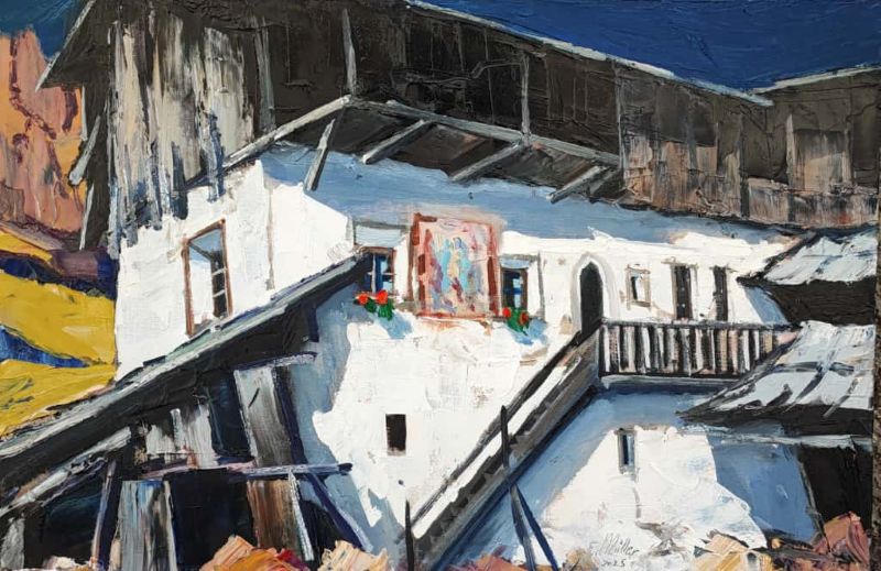 Ernst Müller, geboren 1951 in Schlanders, verbringt seine Kindheit auf verschiedenen Bauernhöfen Südtirols. Genau wie seine zehn Brüder, wird er häufig zur Arbeit auf den nahen Almen geschickt. Diese langen Sommermonate fern von seinem Zuhause, lösen in ihm ein starkes Gefühl von Nostalgie und Heimweh aus, das sich als zentrales Thema durch seine Arbeiten zieht. 1964 lernt Ernst Müller einen Kunstmaler kennen und macht die ersten Malversuche. Zwei Jahre später beginnt Müller eine Lehre als Karosseriebauer. In den folgenden Jahren arbeitet der Künstler hart an einem eigenen Stil um seine in der Kindheit verinnerlichten Erlebnisse auf Leinwand zu bringen. So besucht er 1975 die Sommerakademie in Bruneck die er in den darauf folgenden Jahren immer wieder besucht, eröffnet seine eigene Werkstatt in Lana und stellt seine Arbeiten in einer ersten Werkschau aus. 1979 wird Ernst Müller an der Akademie der Bildenden Künste in München aufgenommen, sagt dann aber seiner Familie zuliebe das Studium ab. Während seiner Arbeit als Künstler, realisiert Müller großformatige Bühnenbilder und eindrucksvolle Wandbilder. 1990 wird Ernst Müller im Kunstbuch „Arte italiana contemporanea“ eingetragen und im Jahr 2004 folgt eine Erwähnung im „Catalogo internazionale dell’arte contemporanea“. Müller beginnt 2002 mit Alpinklettern. Er erhält dadurch einen neuen Blick auf die Natur, seine Landschaftsbilder verändern sich zusehends. Im Jahr 2006 beauftragt Reinhold Messner den Künstler Ernst Müller Schloss Sigmundskron für das MMM (Messner Mountain Museum, bei Bozen) zu malen.